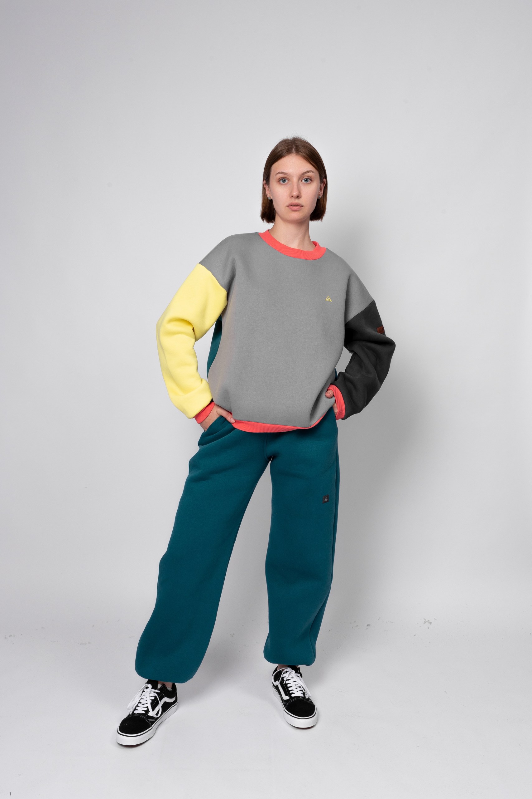 - Брюки: свободный силуэт, манжеты на резинке, регулировка пояса, два кармана.